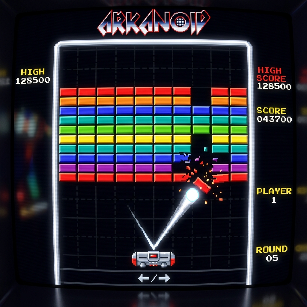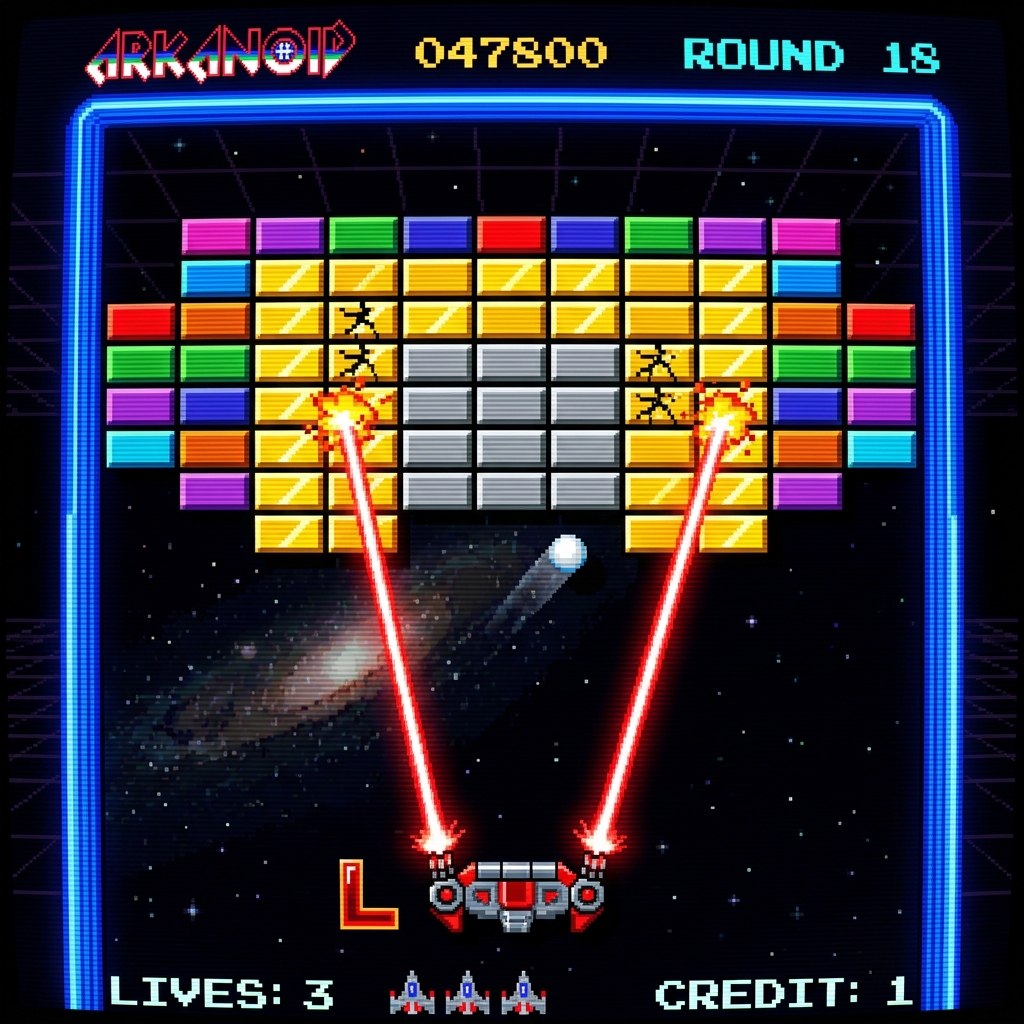 Arkanoid Online は、1980年代アーケードを代表するブロック崩しの魅力をブラウザで楽しめるゲームです。画面下のパドル「Vaus」を左右に動かし、エネルギーボールを跳ね返して色とりどりのブロックを壊していきます。